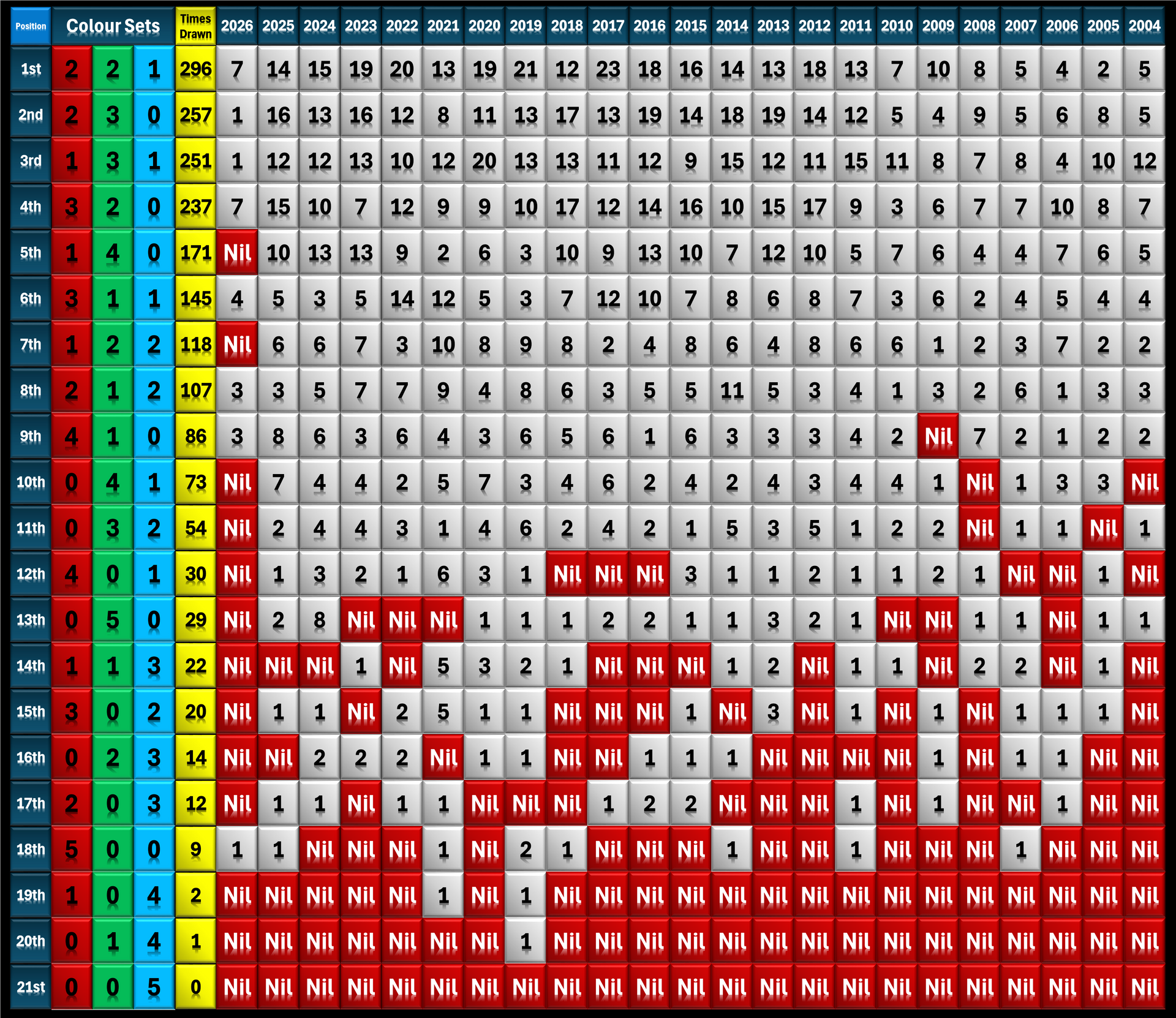 Blue (Trailing Numbers) these numbers were among the last to be drawn following the first draw in 2004.