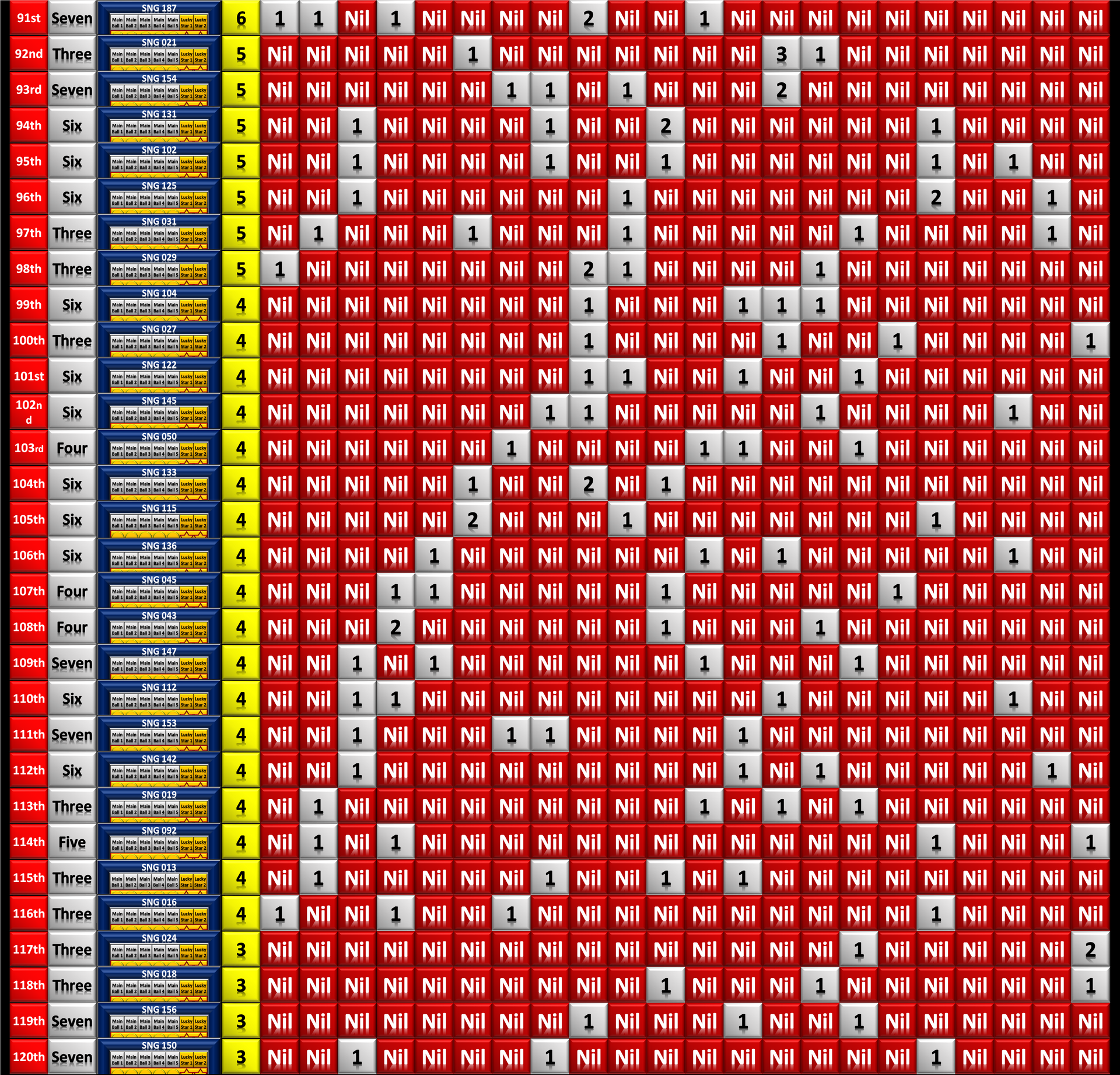 Even though there are 196 SNG's in total and the top 35 appear in more than half of all Euromillions draws, there's also a smaller group which are all in the top 35 but appear more consistently than all the other SNG's and have only failed to appear in one or two years throughout the history of Euromillions.