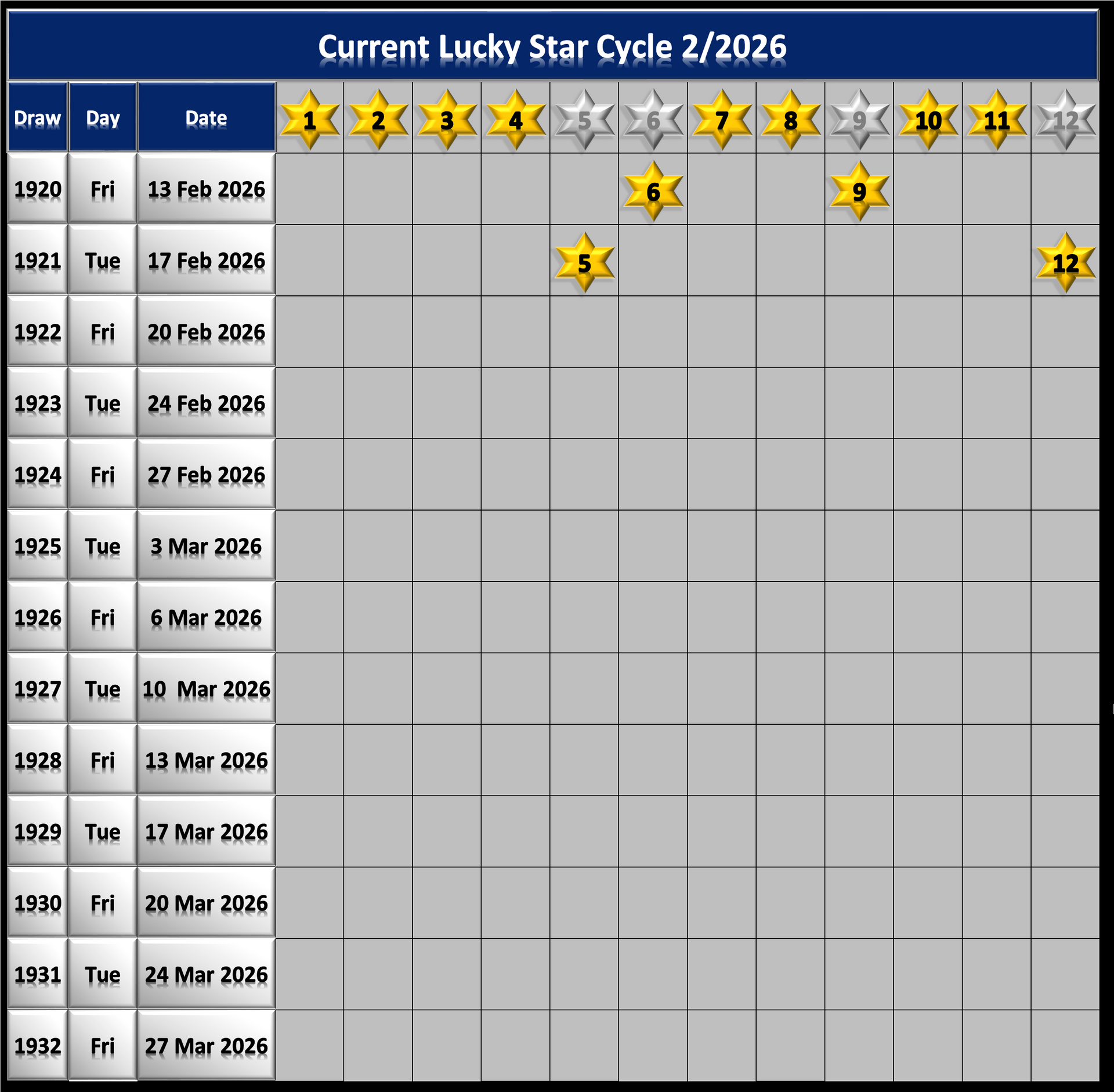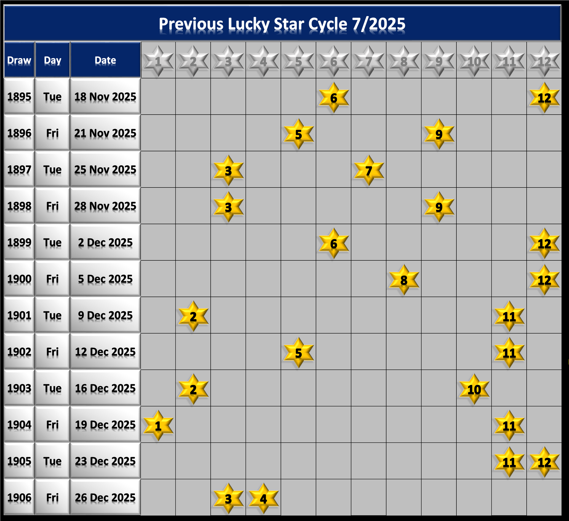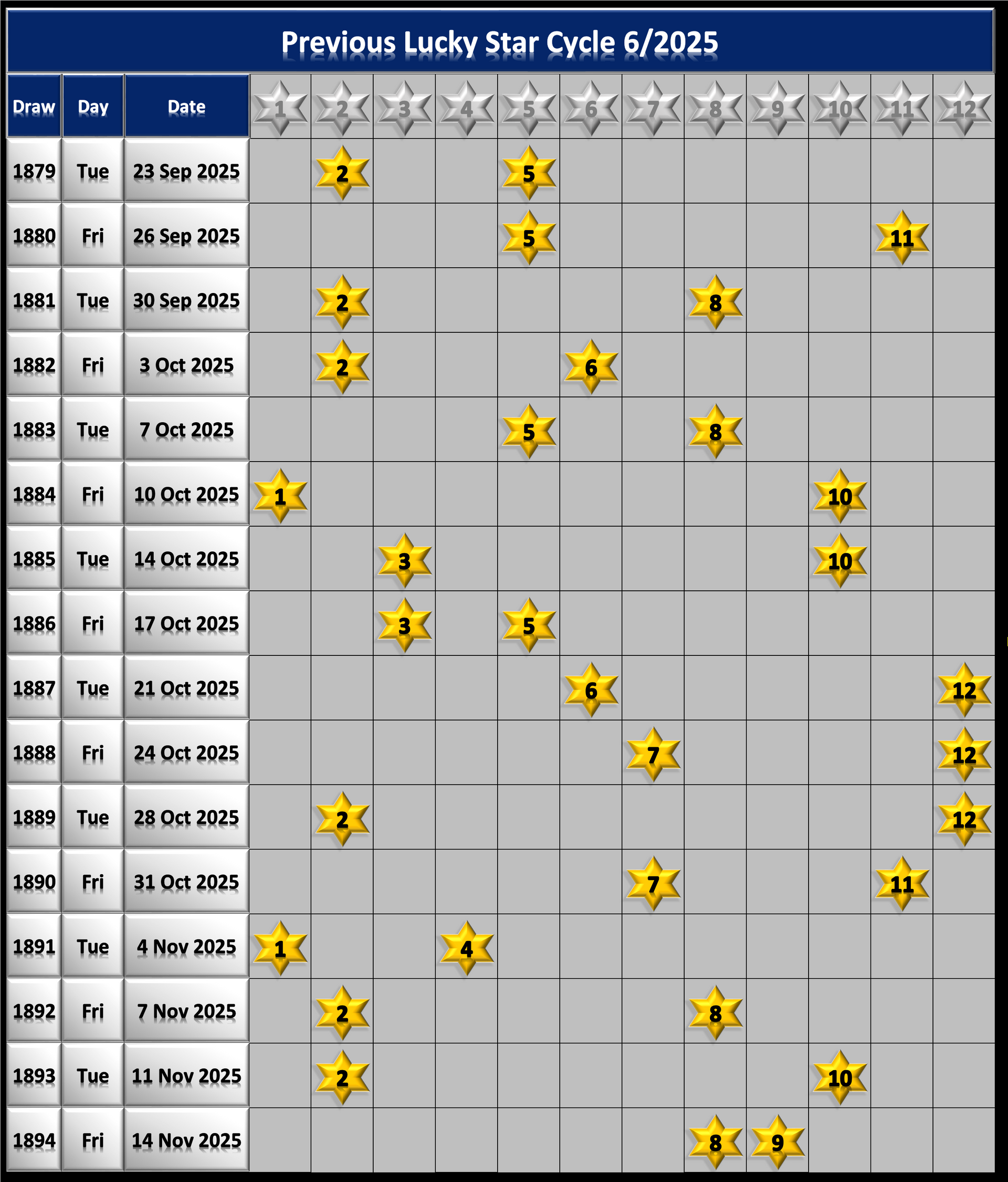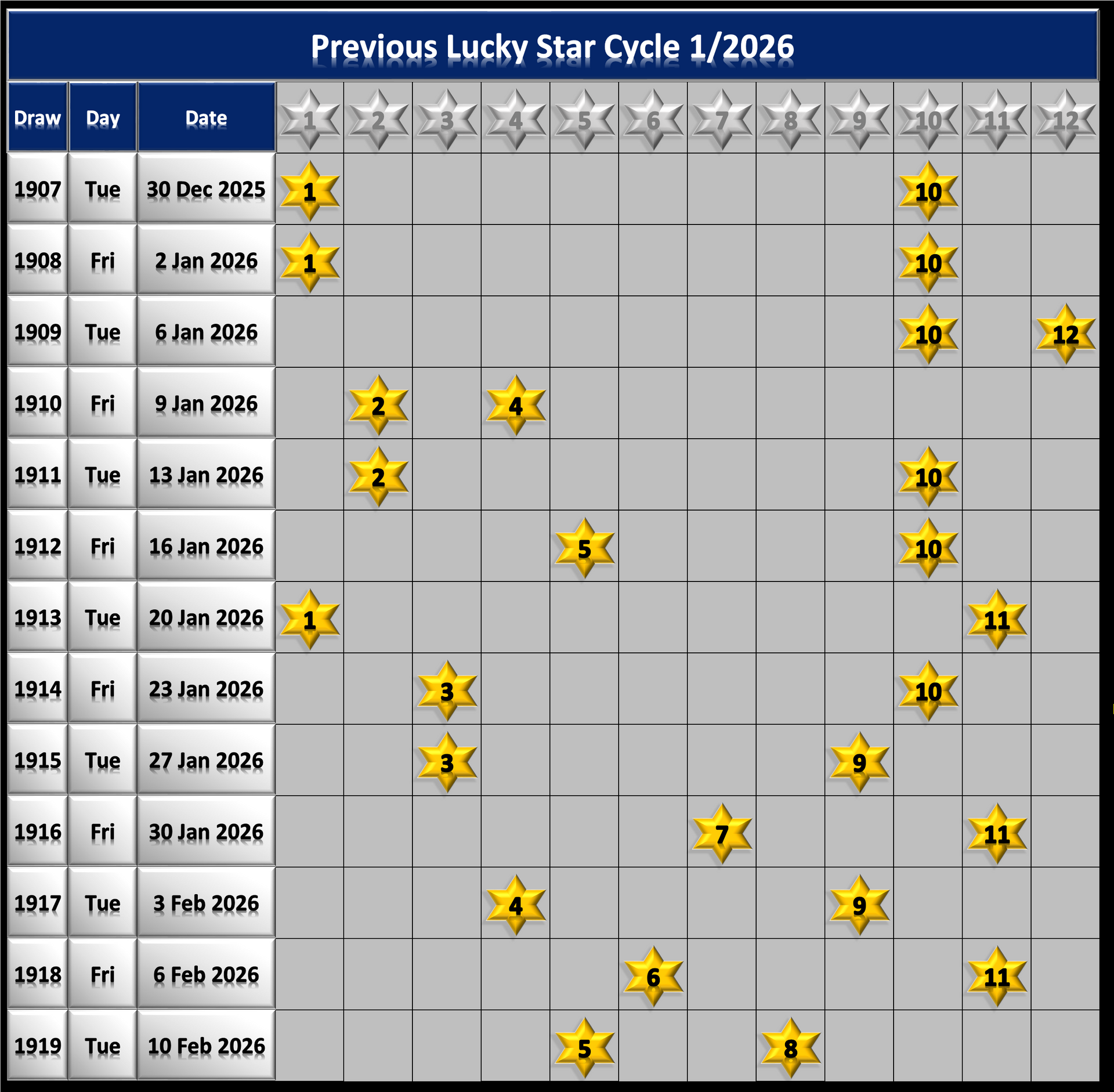 - Because there's only 12 Lucky Star Numbers they tend to cycle through quite quickly so keep an eye on the Lucky Star Cycle charts below the main graphic. A cycle is were each one of the 12 Lucky Stars have been drawn at least once.