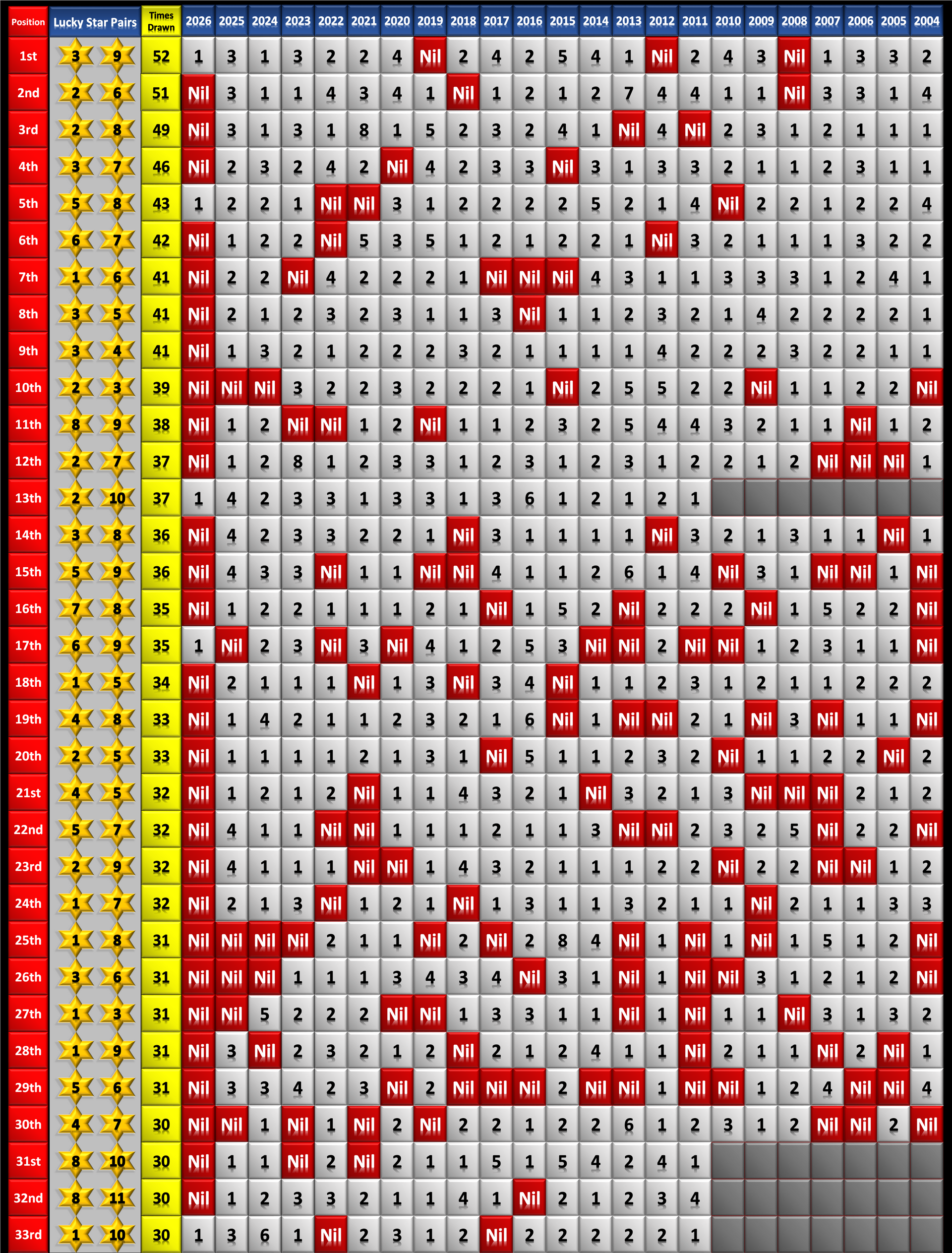 - But always bear in mind that not every one of the 66 Lucky Stars Pairs are drawn in any given year.