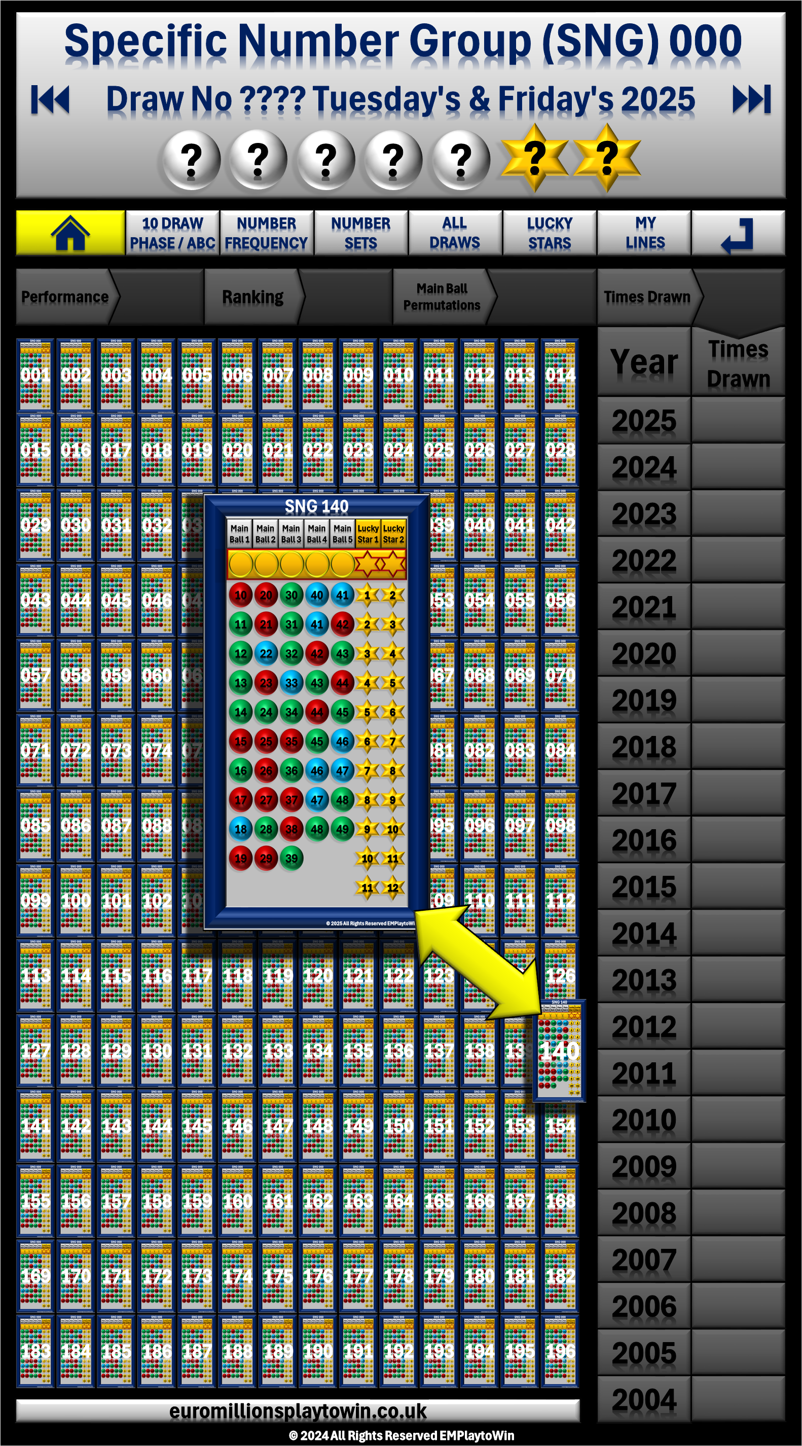 - A Specific Number Group (SNG) contains a unique sequence of numbers between 1 and 50 for Euromillions Main Ball Numbers and 1 to 12 for the Lucky Stars Pairs. There are 196 SNG's which make up all 139,838,160 Euromillions permutation.
