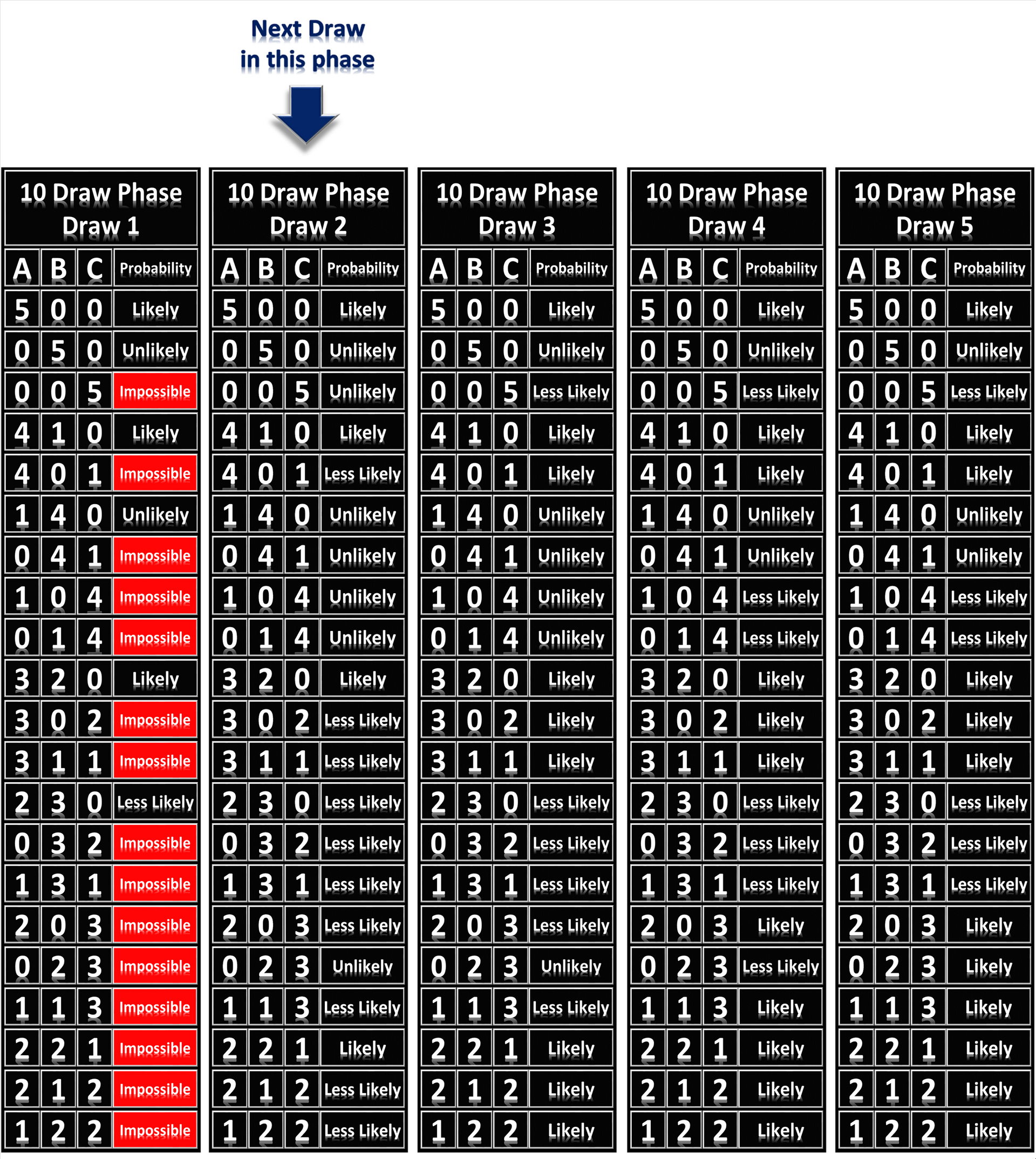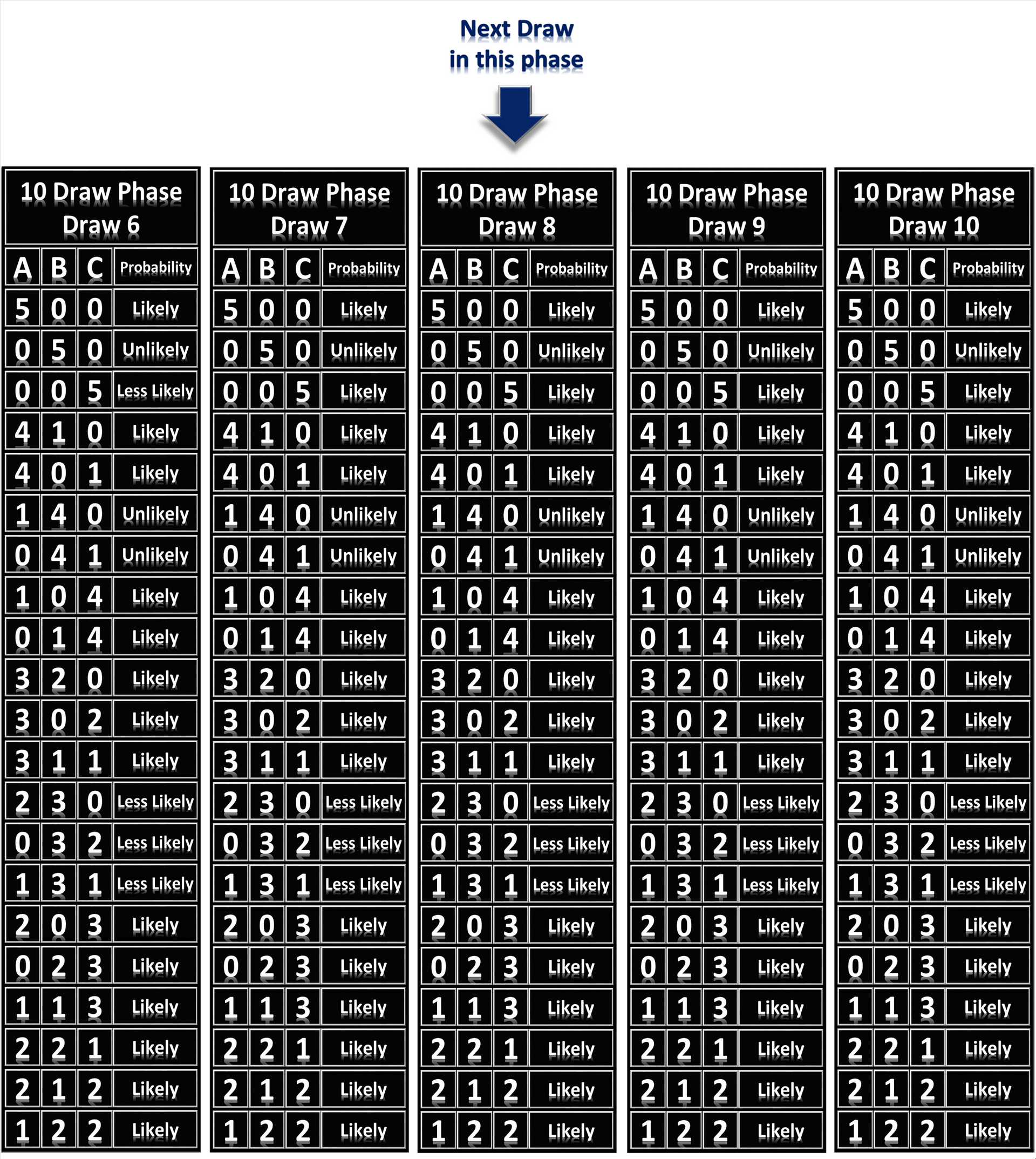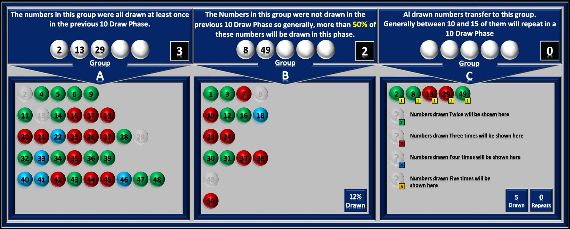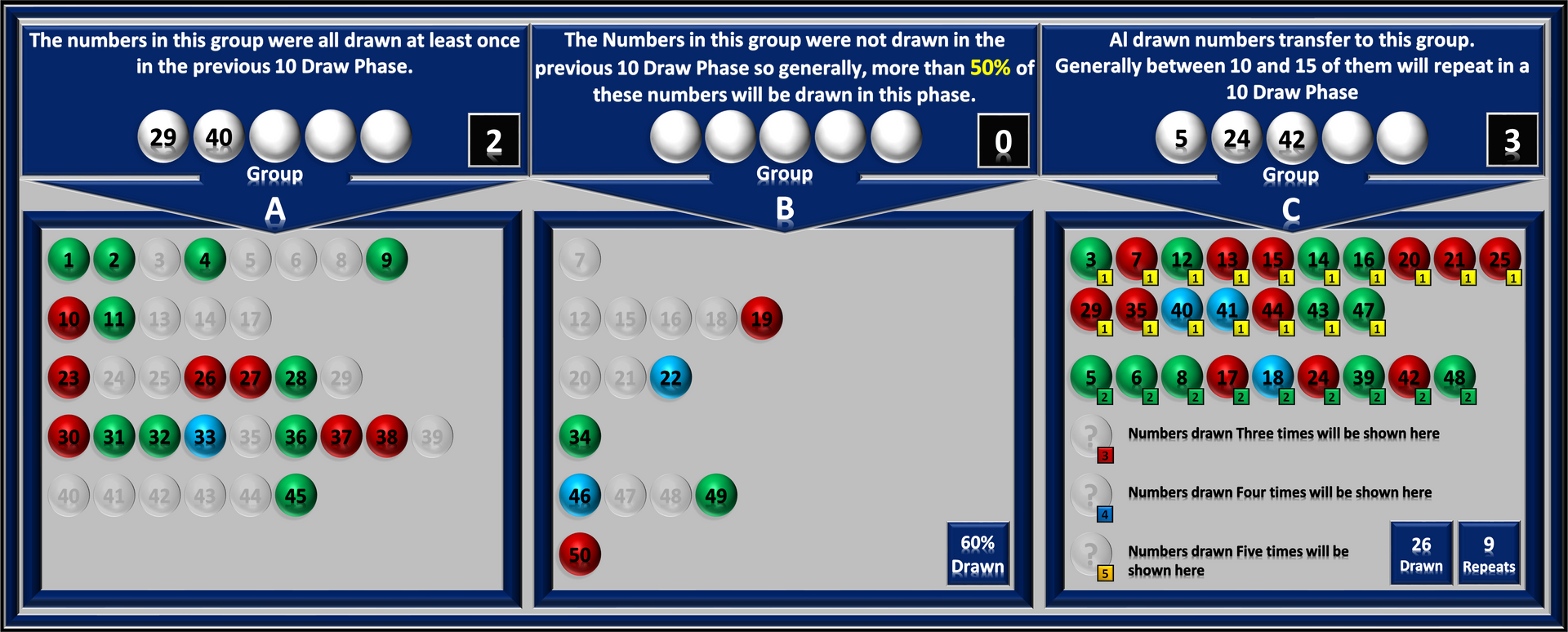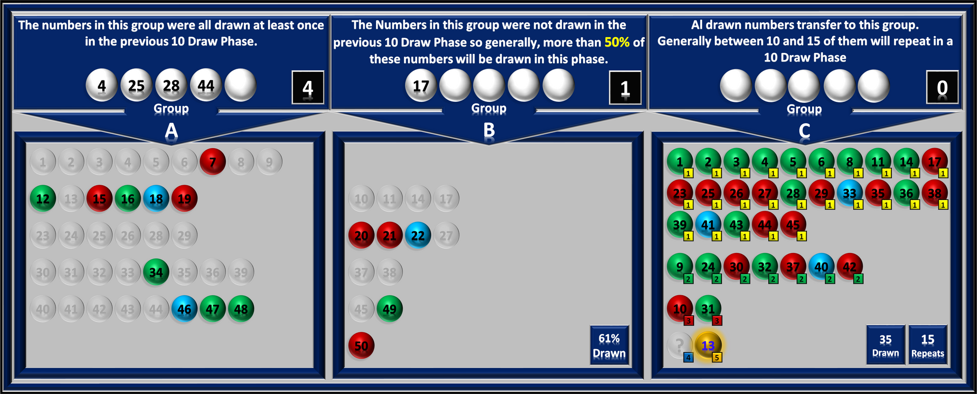 So, the 10 Draw Phase and ABC Groups are just a simple resource which helps to keep track of those numbers that have been drawn and are yet to, or more likely to, be drawn in the coming draws within the 10 Draw Phase.
