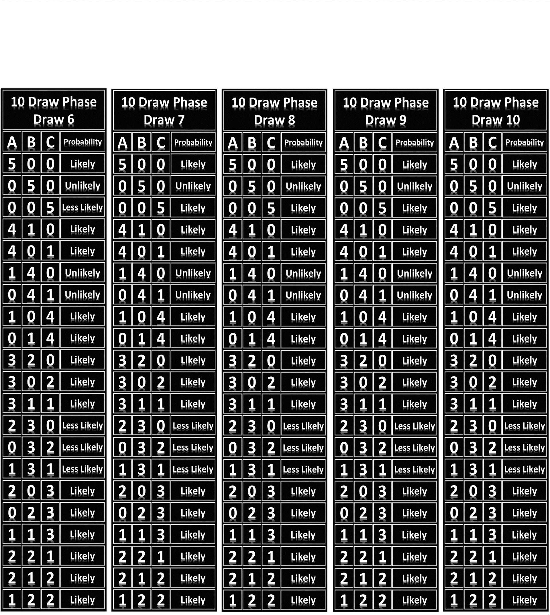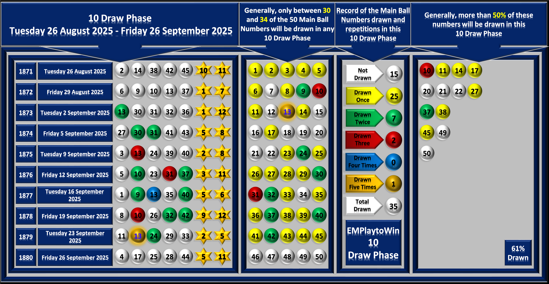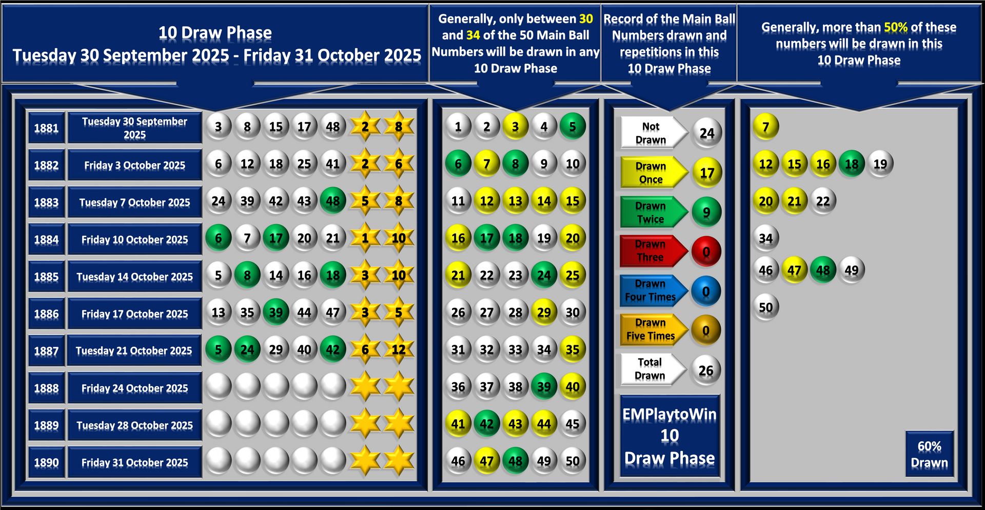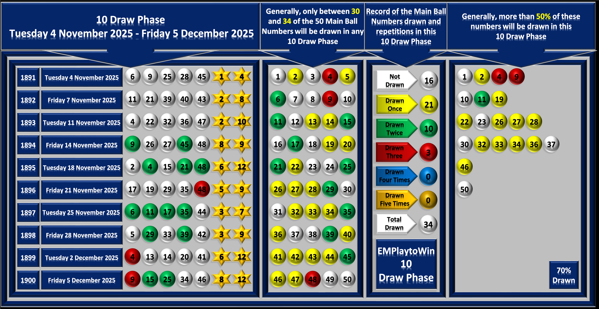 Generally, between 30 and 34 of the 50 Main Ball Numbers are drawn every 10 draws and 50% or more of the 16 to 20 numbers that are not drawn in one phase have a higher than average probability of being drawn in the next 10 draws and so on.