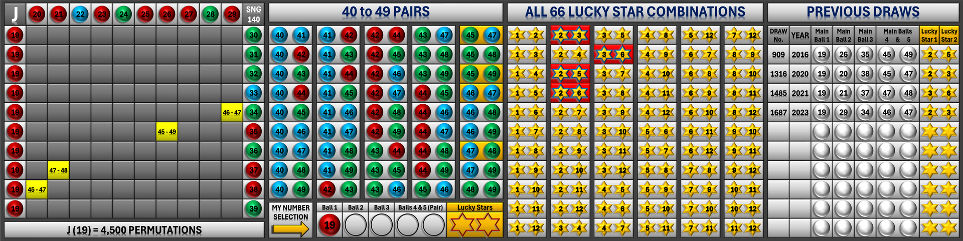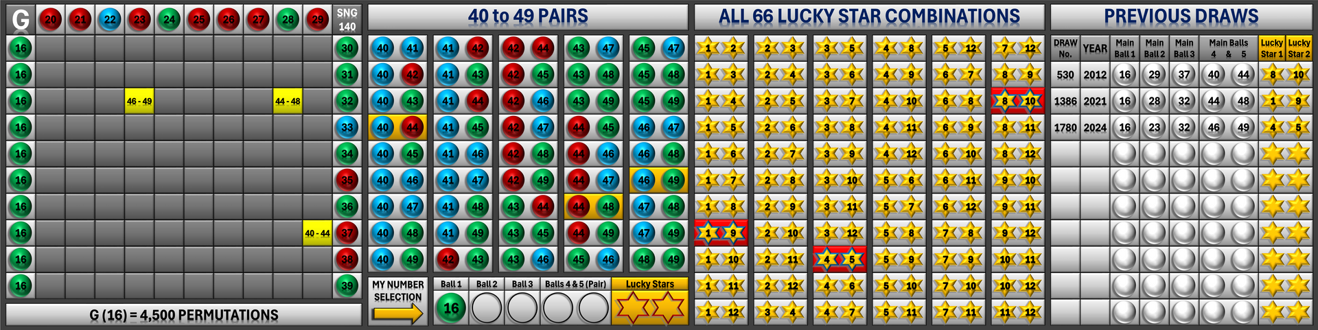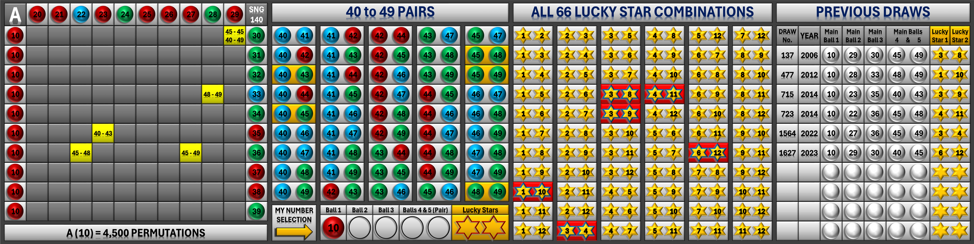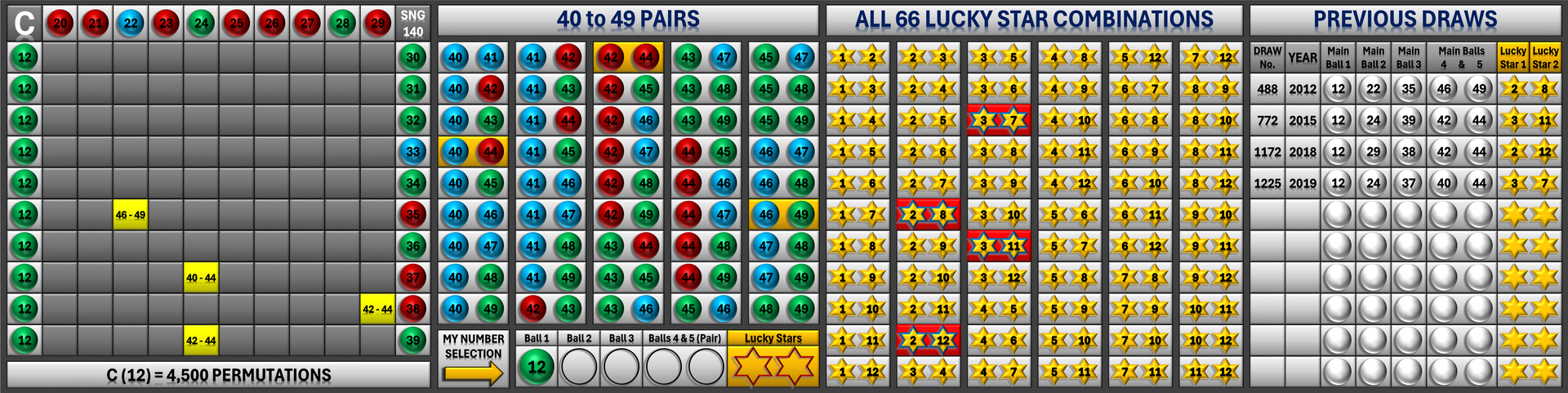 The Lucky Star Combinations show all possible 66 permutations of the 12 Lucky Stars. Those previously drawn in this SNG are also highlighted.