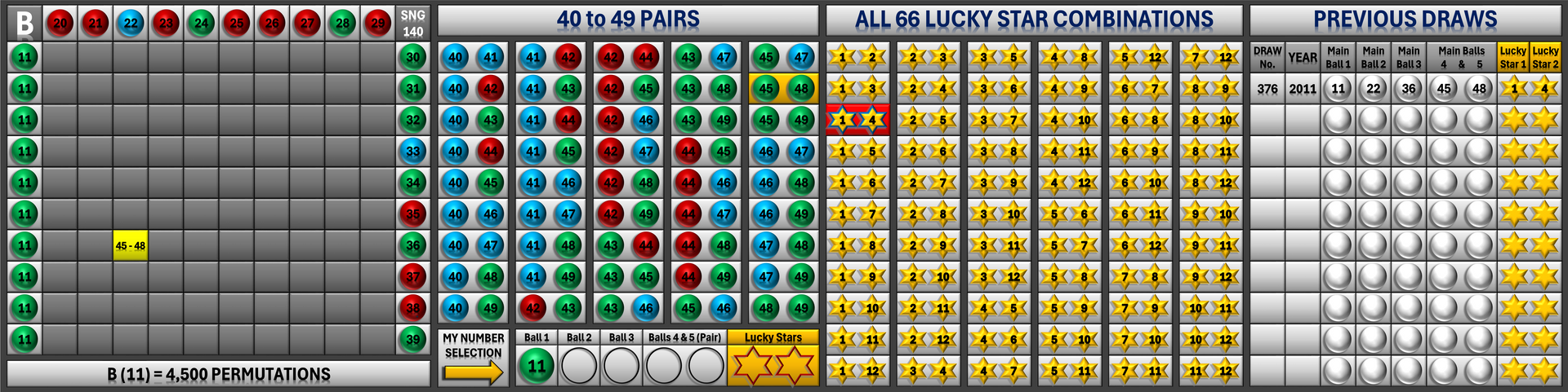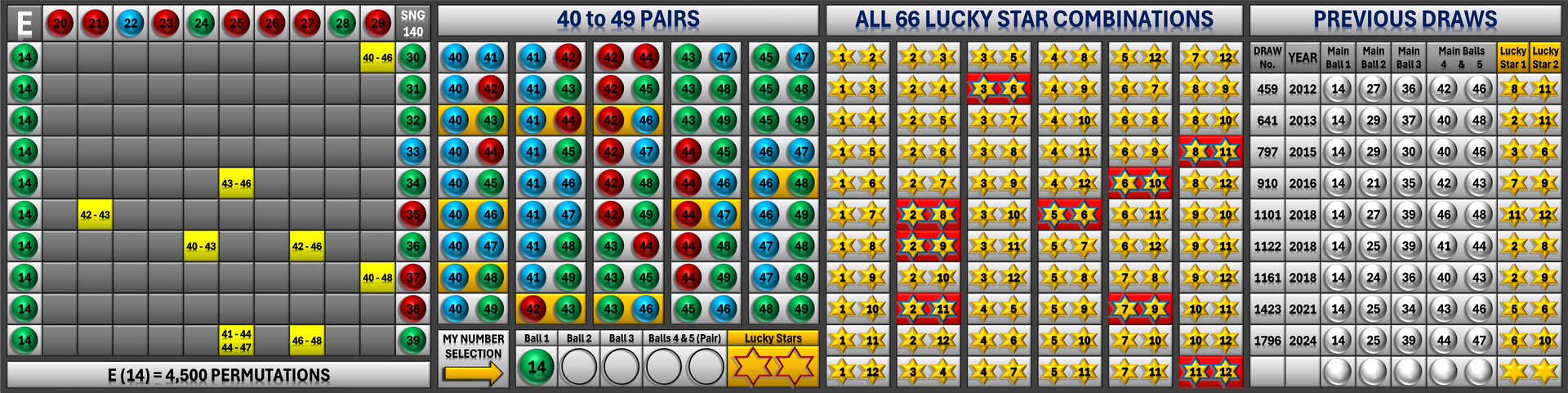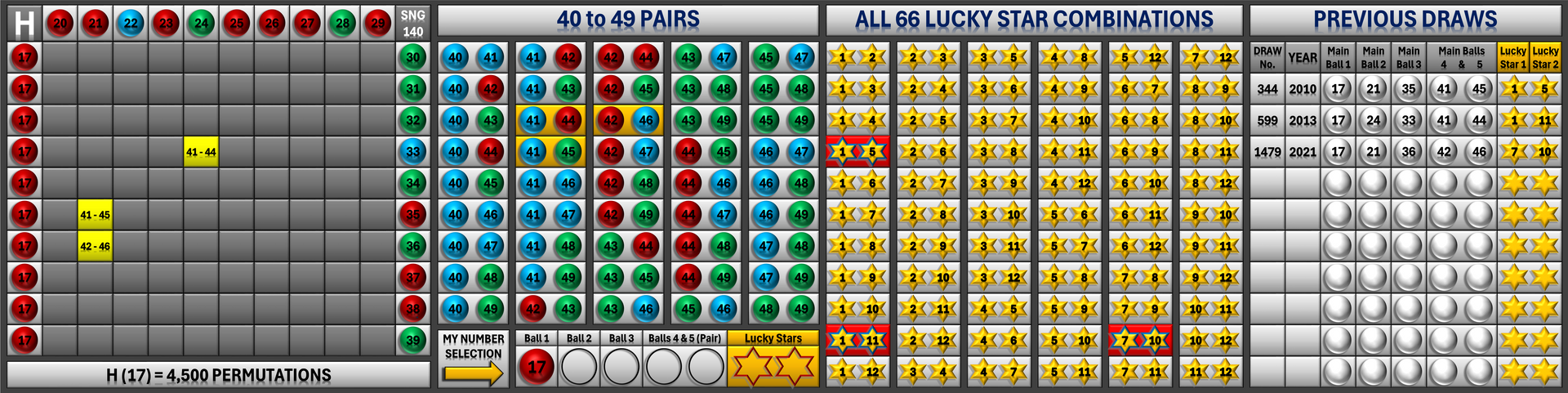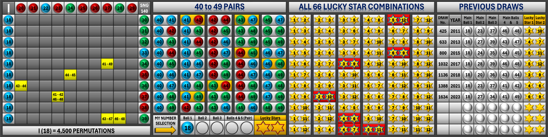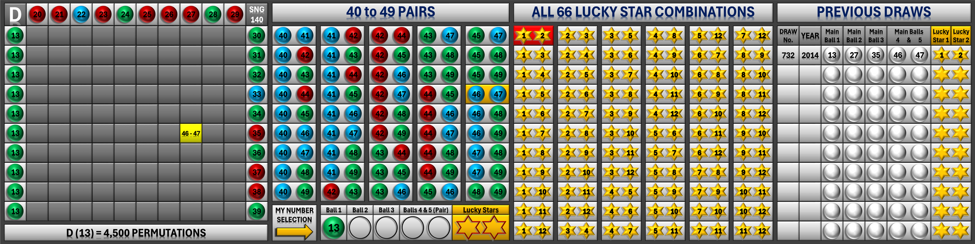 The Lucky Star Combinations show all possible 66 permutations of the 12 Lucky Stars. Those previously drawn in this SNG are also highlighted.