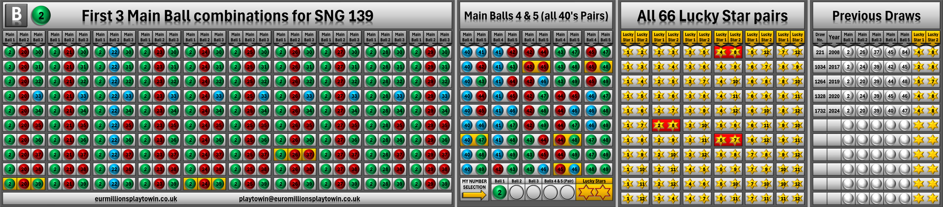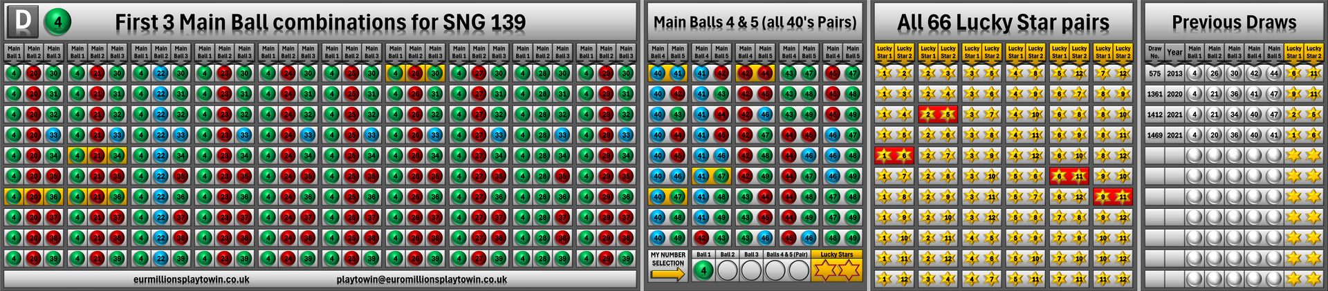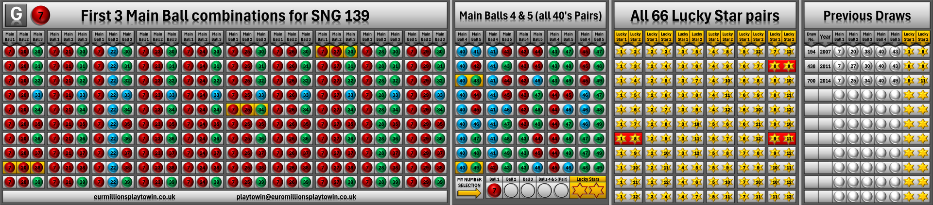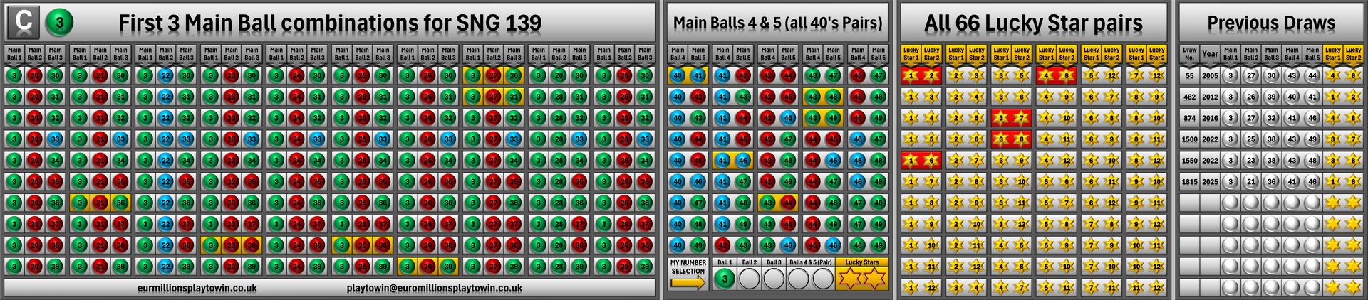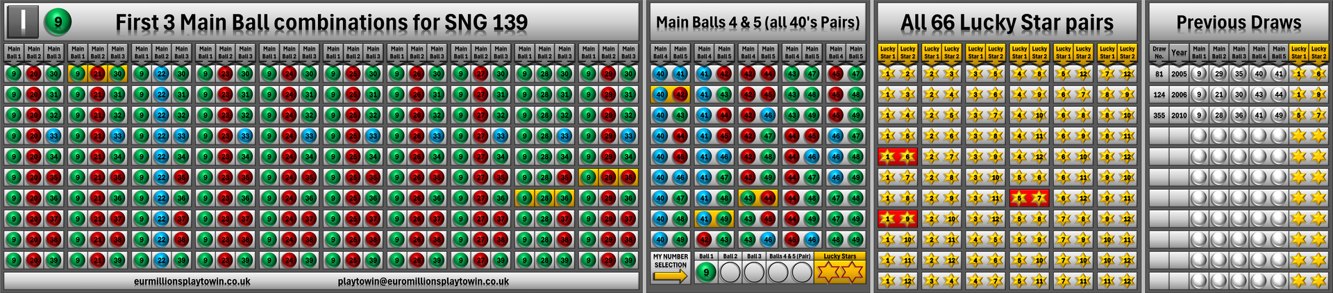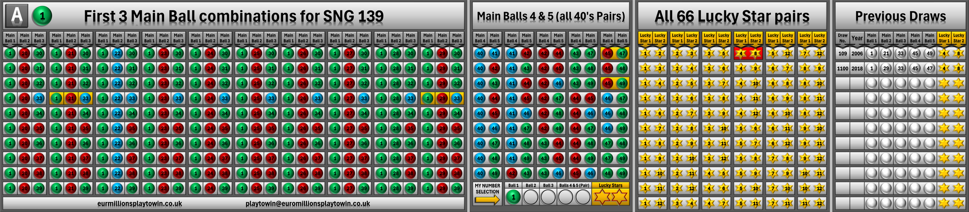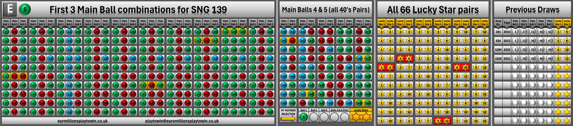 Every single one of the 40,500 Main Ball Permutations (MBP's) can be created using these number blocks and more importantly, every single one of the 2.6 million full 5 main Ball Numbers and both Lucky Star Permutations within SNG 139.