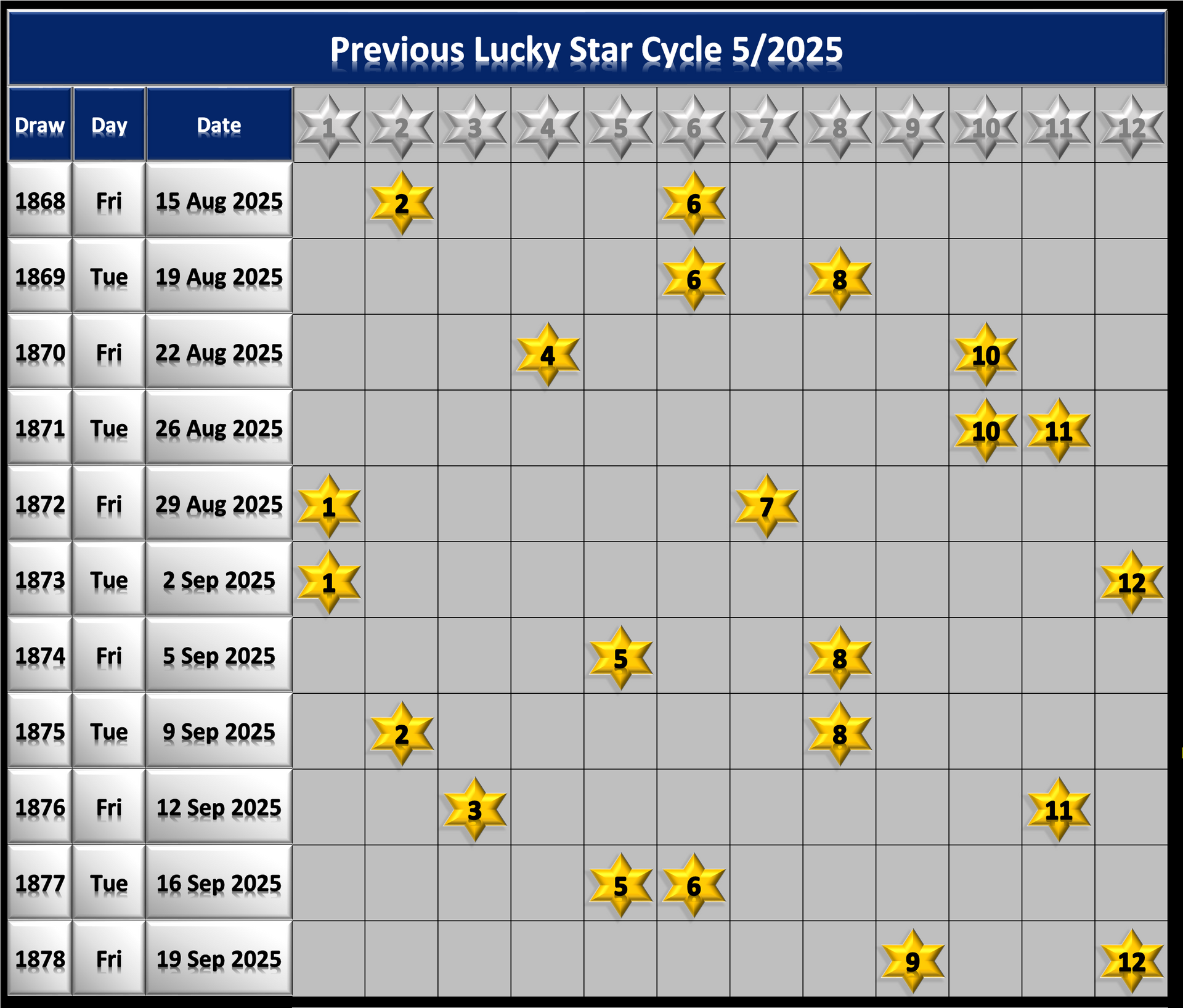 - Because there's only 12 Lucky Star Numbers they tend to cycle through quite quickly so keep an eye on the Lucky Star Cycle charts below the main graphic. A cycle is were each one of the 12 Lucky Stars have been drawn at least once.