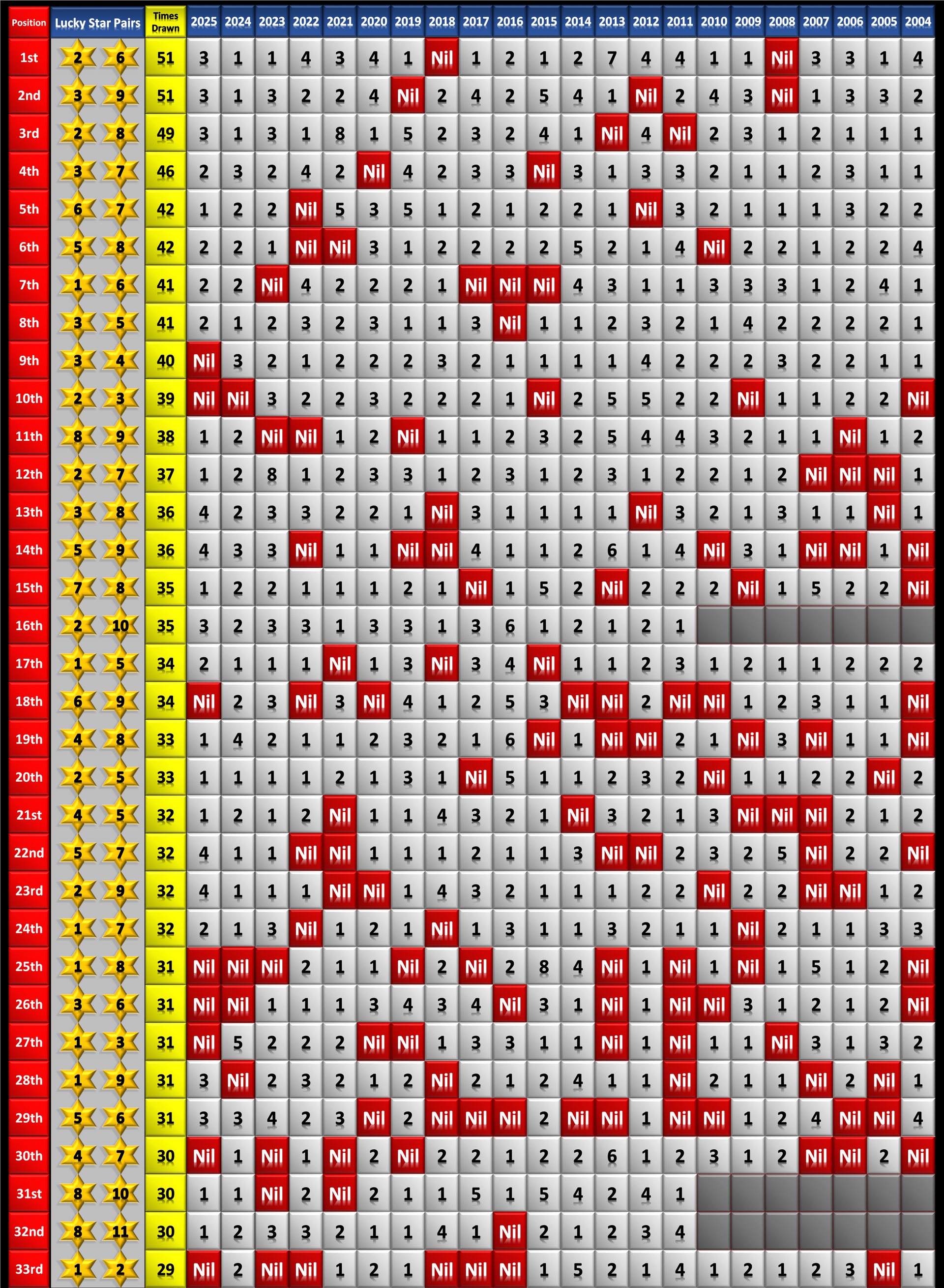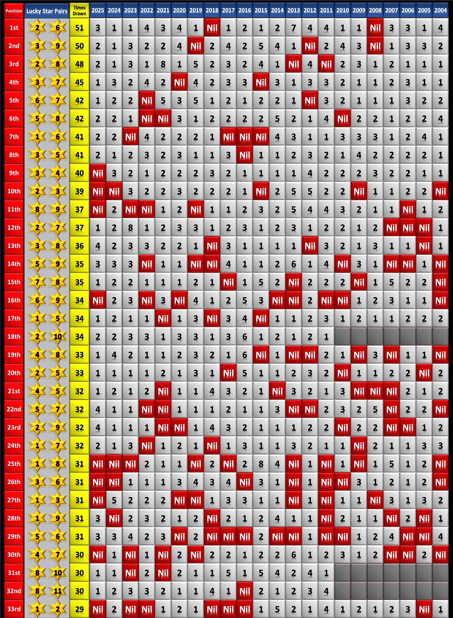 - But always bear in mind that not every one of the 66 Lucky Stars Pairs are drawn in any given year.