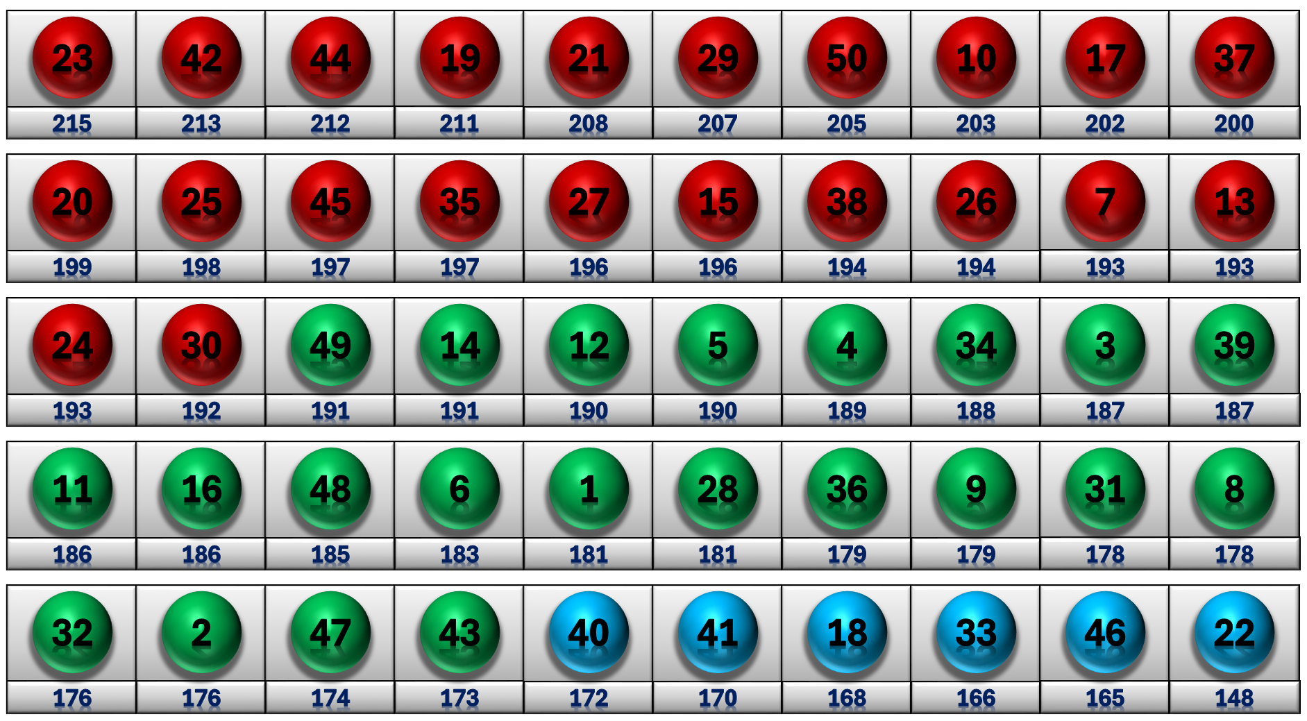 - This is a handy chart to keep you updated with the frequency and colour of each number.